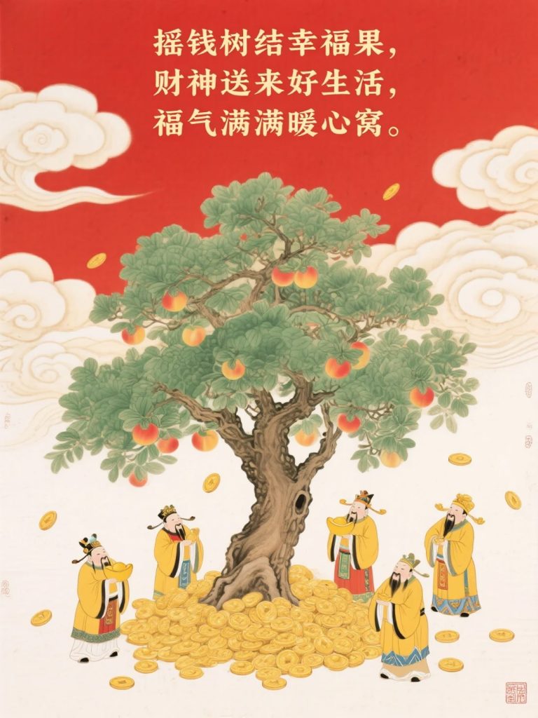 Chủ đề: Hình ảnh này lấy biểu tượng “cây tiền” (摇钱树 – Yêu tiền thụ) làm trung tâm, kết hợp với các vị thần tài, tạo nên một bức tranh về sự sung túc, trù phú và may mắn.